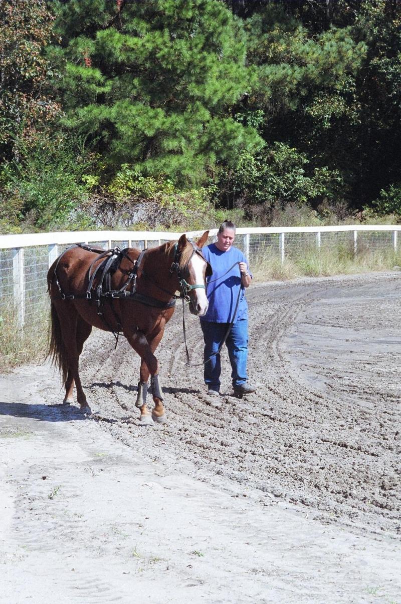 Buddy is our official mascot. He'll never be ridden, having had the bad luck of a genetic defect called HERDA, but he lives life to the fullest - he plays with the dogs, and loves his baths and brushings! Shown here being taught to drive by one of our trainers, Jennifer Fiske.