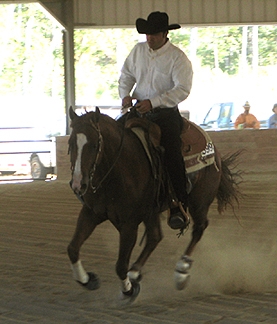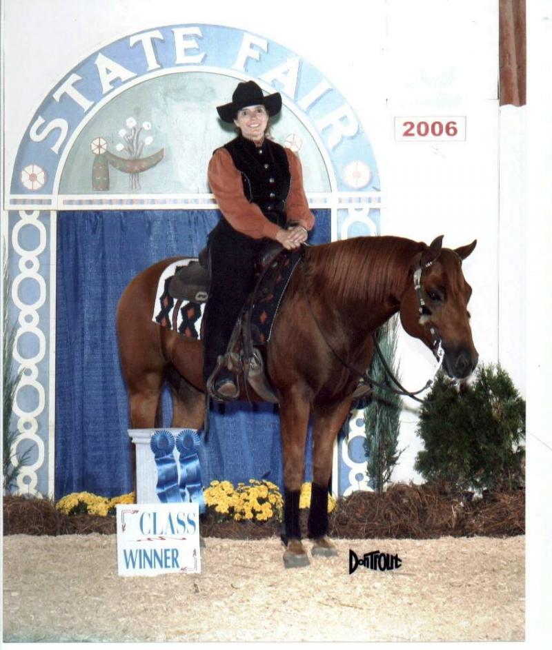 Pete is an NRHA Futurity Finalist, having bested almost 600 horses to make the top 30 finals in 2004. He's won a saddle, buckles, trophies and NRHA money in very limited showing, and has been successful in the professional ("Open") and the amateur ("Non Pro") divisions. Here, with Joy at the 2006 NC State Fair