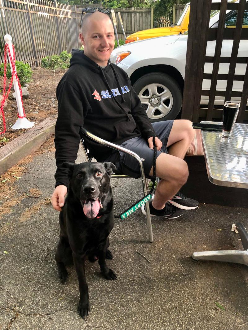 Zeus is a 7 year old neutered Lab/Shepherd. He is a great guy. Perfect house guest (house trained, calm, minimal barking, and only gets on furniture if beckoned). He is happy being around his people and to join them in what they're doing, whether that's lounging on the couch or going on a walk/ out to restaurants/bars. He is good with people, calm dogs, and kids (probably not good with cats). He does have environmental allergies that are managed well with medication. He is being fostered in Raleigh NC